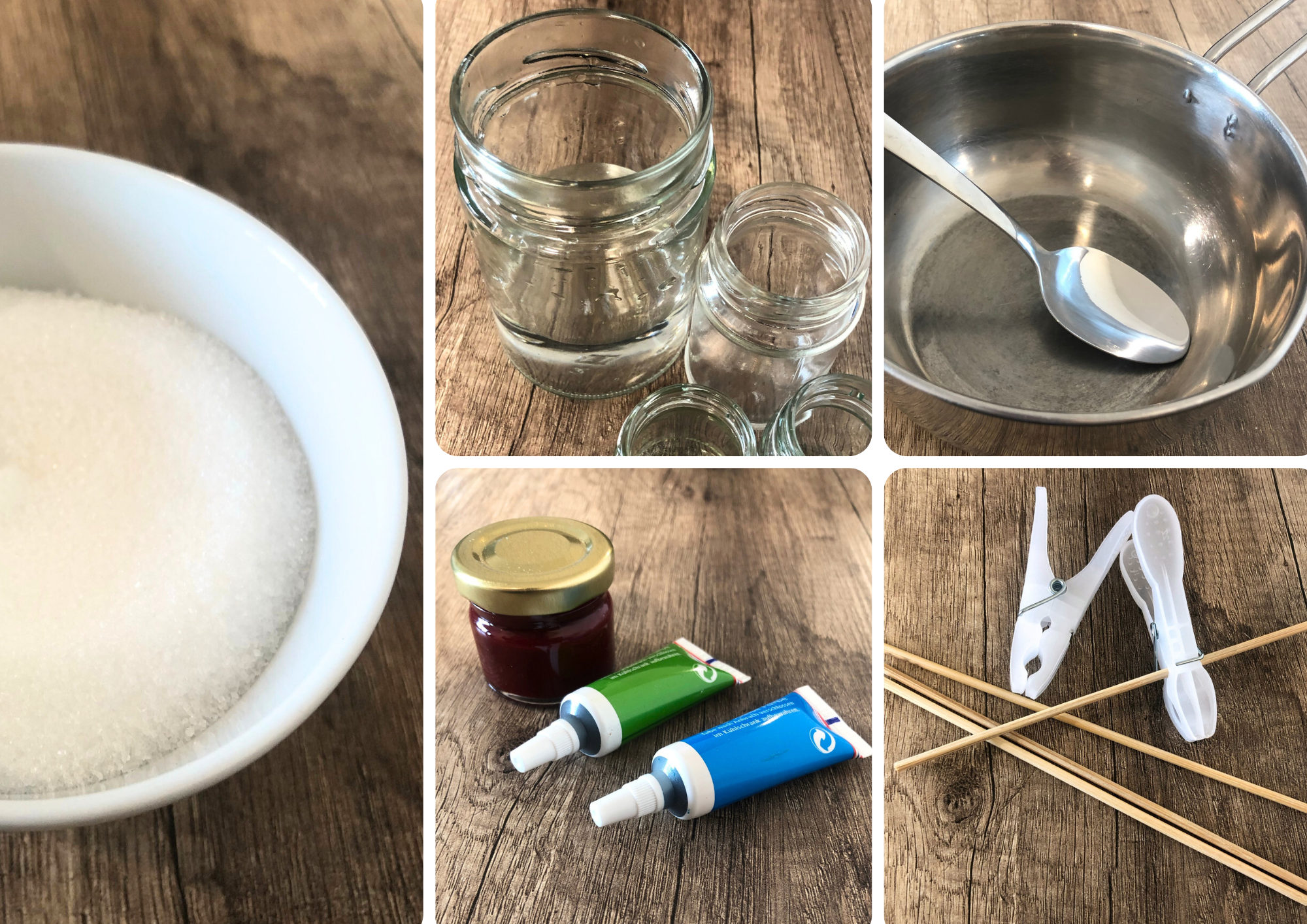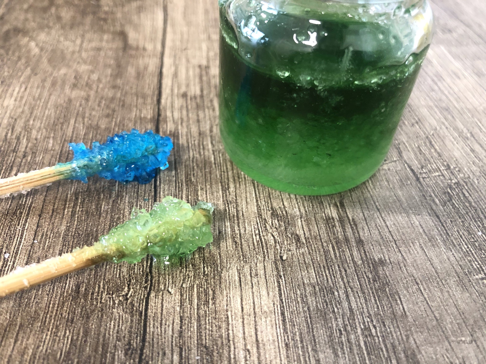 Welchen Unterschied macht es, wenn man die Stäbchen vorher anfeuchtet und in Zucker wälzt? Probiere es aus. Du kannst auch jeden Tag ein Foto machen, um das Wachstum der Kristalle festzuhalten.