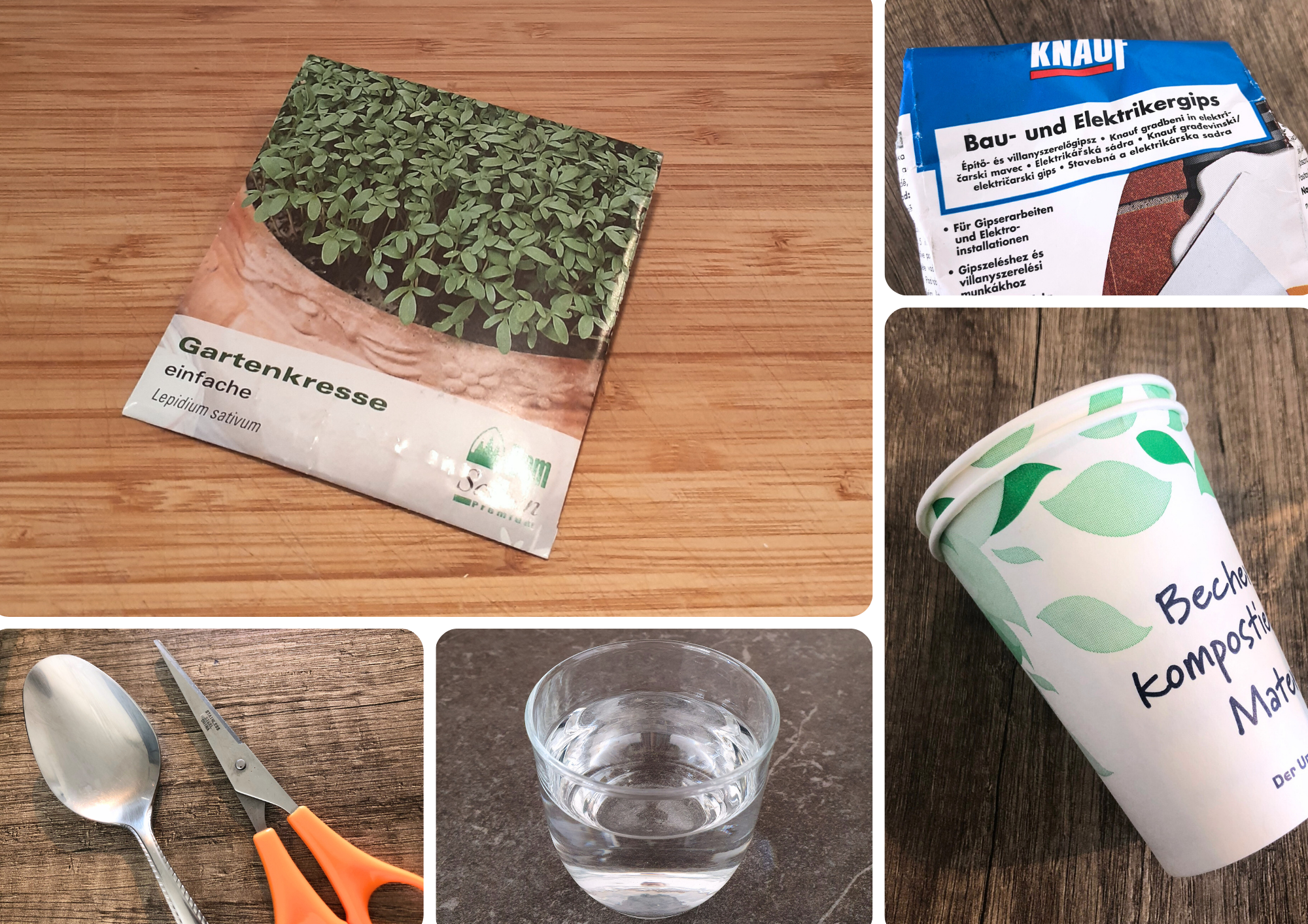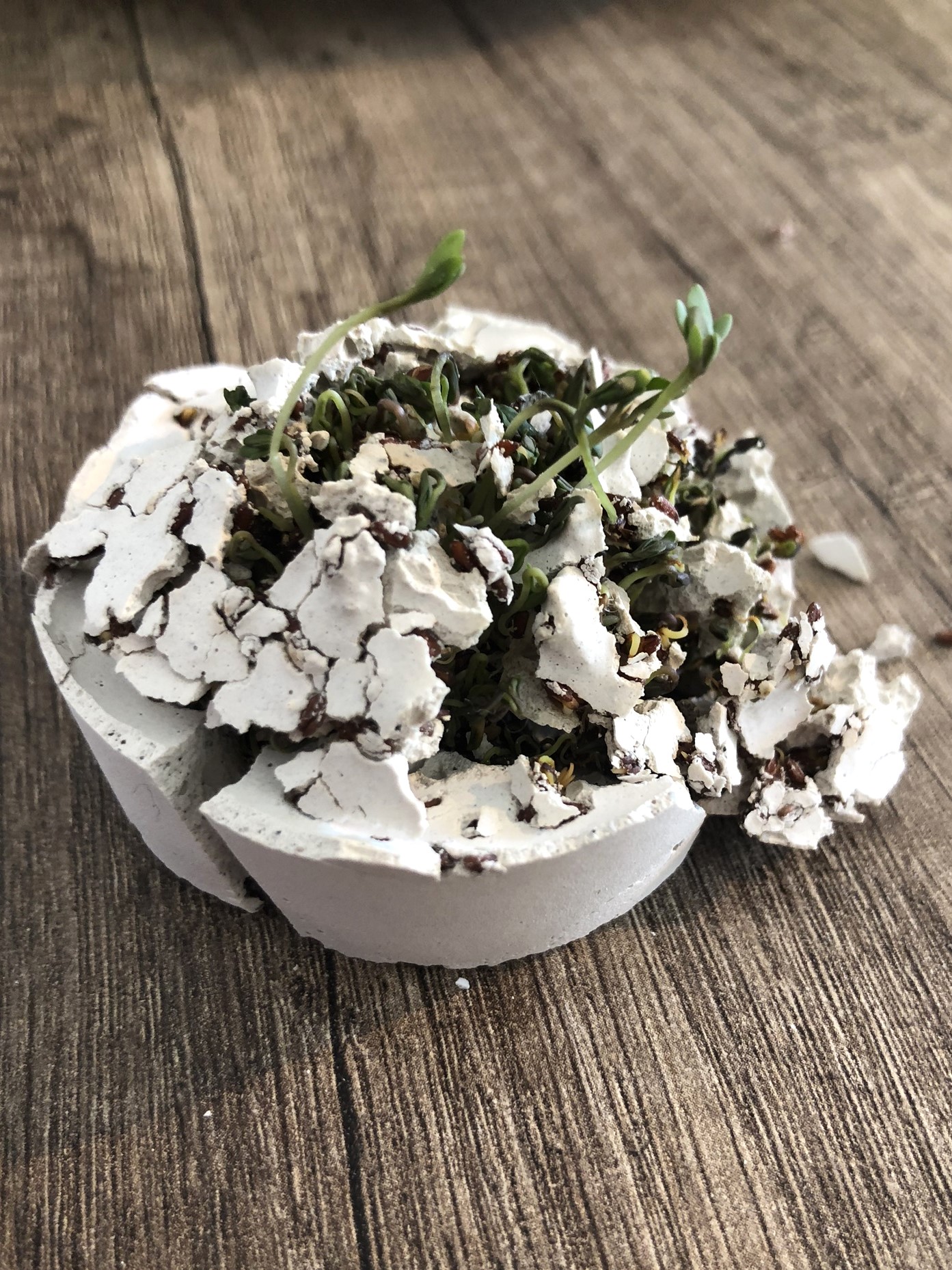 Die Kressesamen enthalten alles, was sie zum Keimen brauchen. Das fehlende Wasser nehmen sie aus dem Gipsbrei auf. Durch die Wasseraufnahme beginnen die Samen zu keimen und in den Pflanzenzellen entsteht ein enormer Druck. Dadurch kann die Pflanze sogar den harten Gips aufsprengen. Das kann man auch manchmal auf der Straße beobachten. Um weiter wachsen zu können, benötigen Samen dann Licht und mehr Wasser.