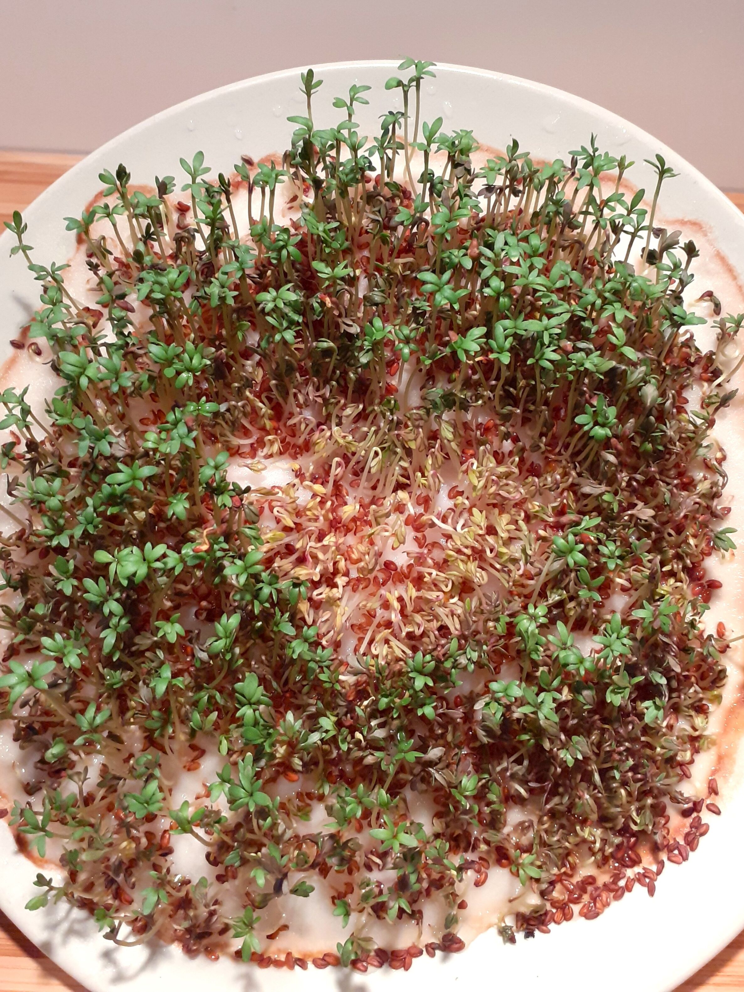 Wir verwenden im Experiment und in der Küche die Keimlinge der Kresse. Die ausgewachsene Pflanze kann aber bis zu 40 cm hoch werden und bildet weiße bis leicht rosafarbene Blüten aus.