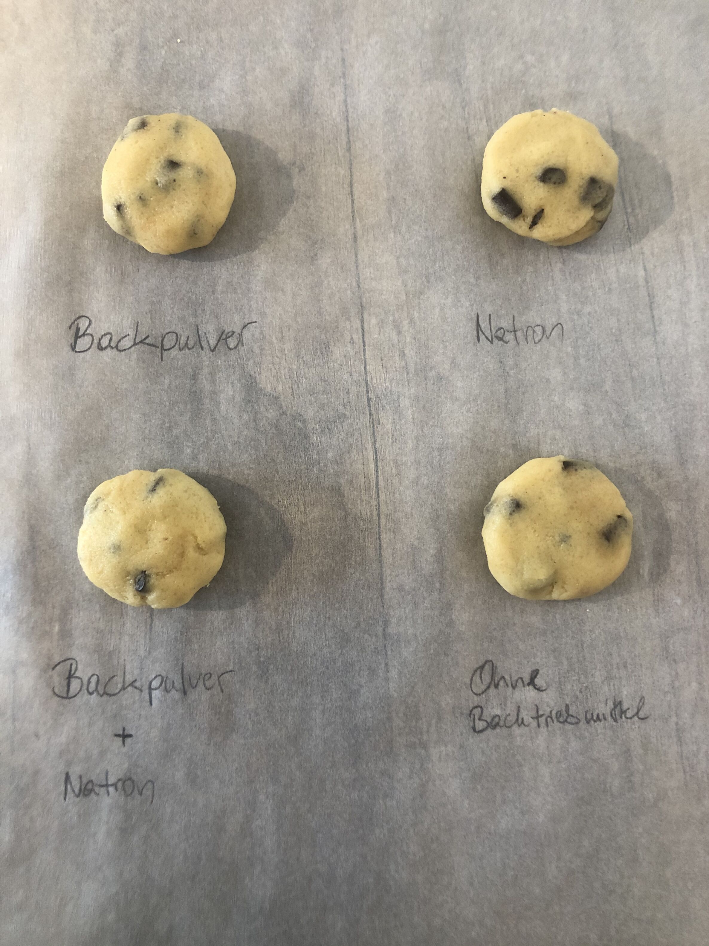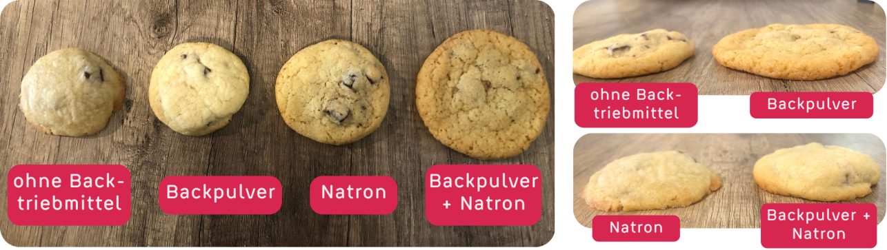 Ohne Backtriebmittel bleibt der Teig sehr kompakt. Damit im Teig Luft entstehen kann, werden Triebmittel genutzt: Durch chemische Reaktionen entsteht Kohlendioxid und der Teig geht beim Backen auf. Natron und Backpulver bewirken nicht das Gleiche und können im Rezept nicht einfach ersetzt werden, wenn man eine der beiden Zutaten nicht zuhause hat. Natron wird chemisch Natriumhydrogencarbonat genannt und sorgt in unseren Keksen vor allem für eine Vergrößerung in der Breite. Backpulver enthält zwar Natron, aber zusätzlich auch Säuerungsmittel. Damit werden die Kekse vor allem höher. Wenn man beide Triebmittel verwendet, kann das Natron auch mit dem Säuerungsmittel im Backpulver reagieren und wir erhalten sehr lockere Kekse. So viel zur Chemie. Was dir am besten schmeckt, musst du mit dem Experiment selbst herausfinden.